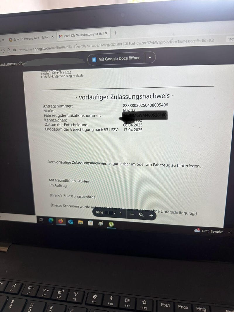 Sie bekommen von uns eine vorläufige Zulassungsbescheinigung, die 10 Tage gültig ist. Das jeweilige Strassenverkehrsamt schickt Ihnen dann die orginalen Unterlagen innerhalb von paar Tagen zu. Sie haben auch die Möglichkeit, diese bei uns im Büro abzuholen.